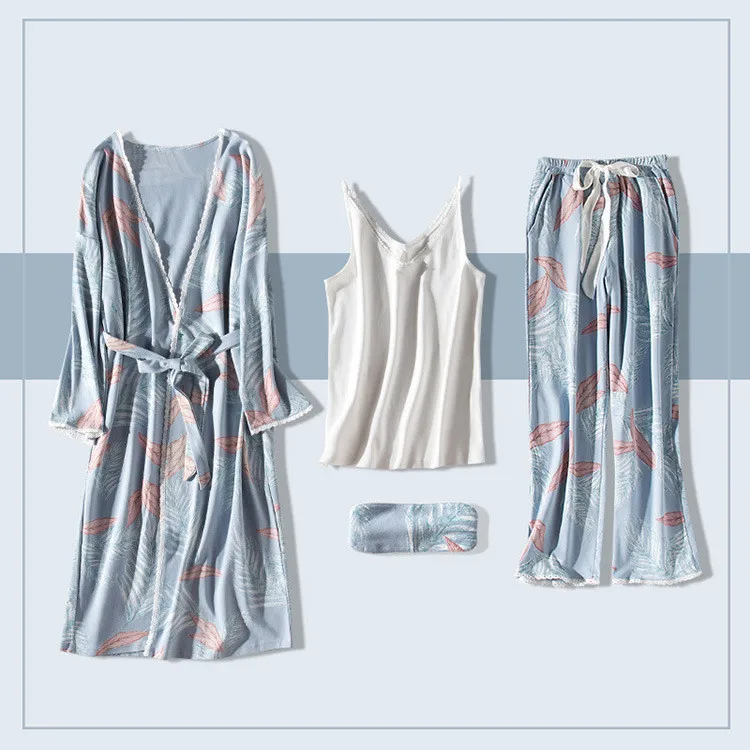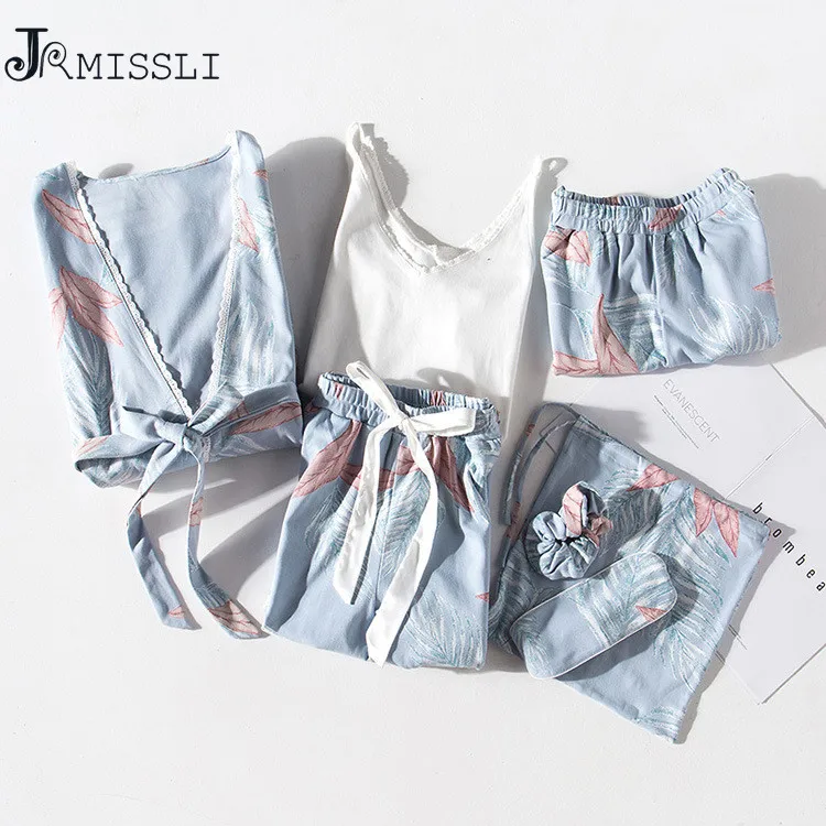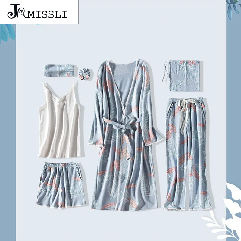 Limited Chance for JRMISSLI New Robe Sexy V-Neck Cotton Robes Sleepwear Spring Autumn Women Pyjama 7 Pieces Set Robe S